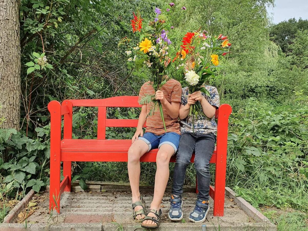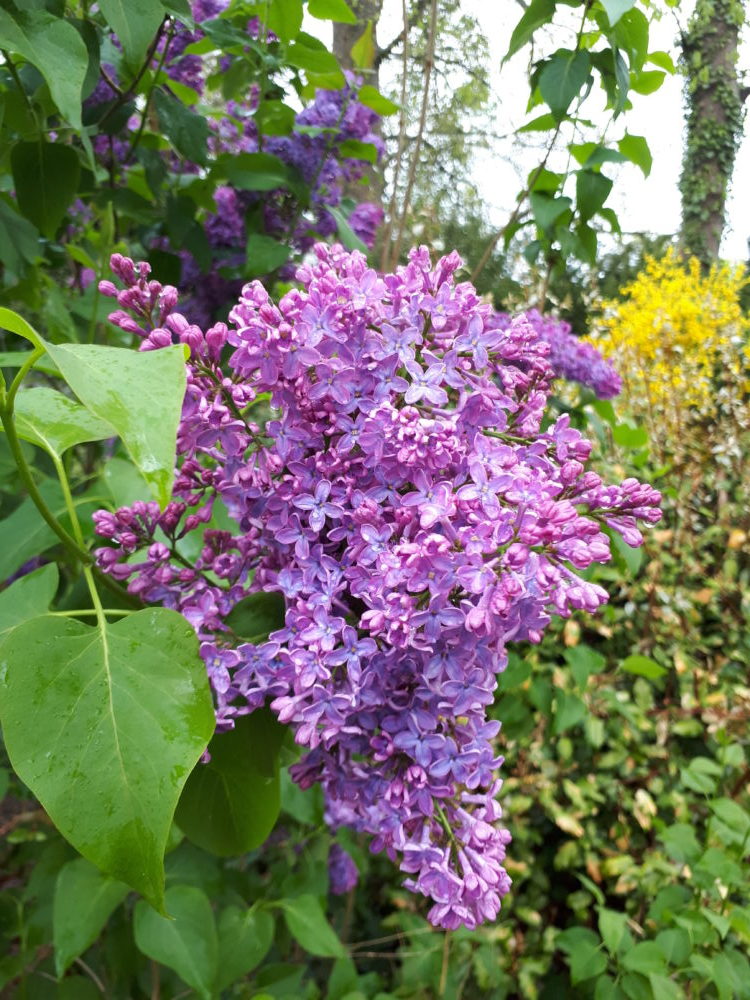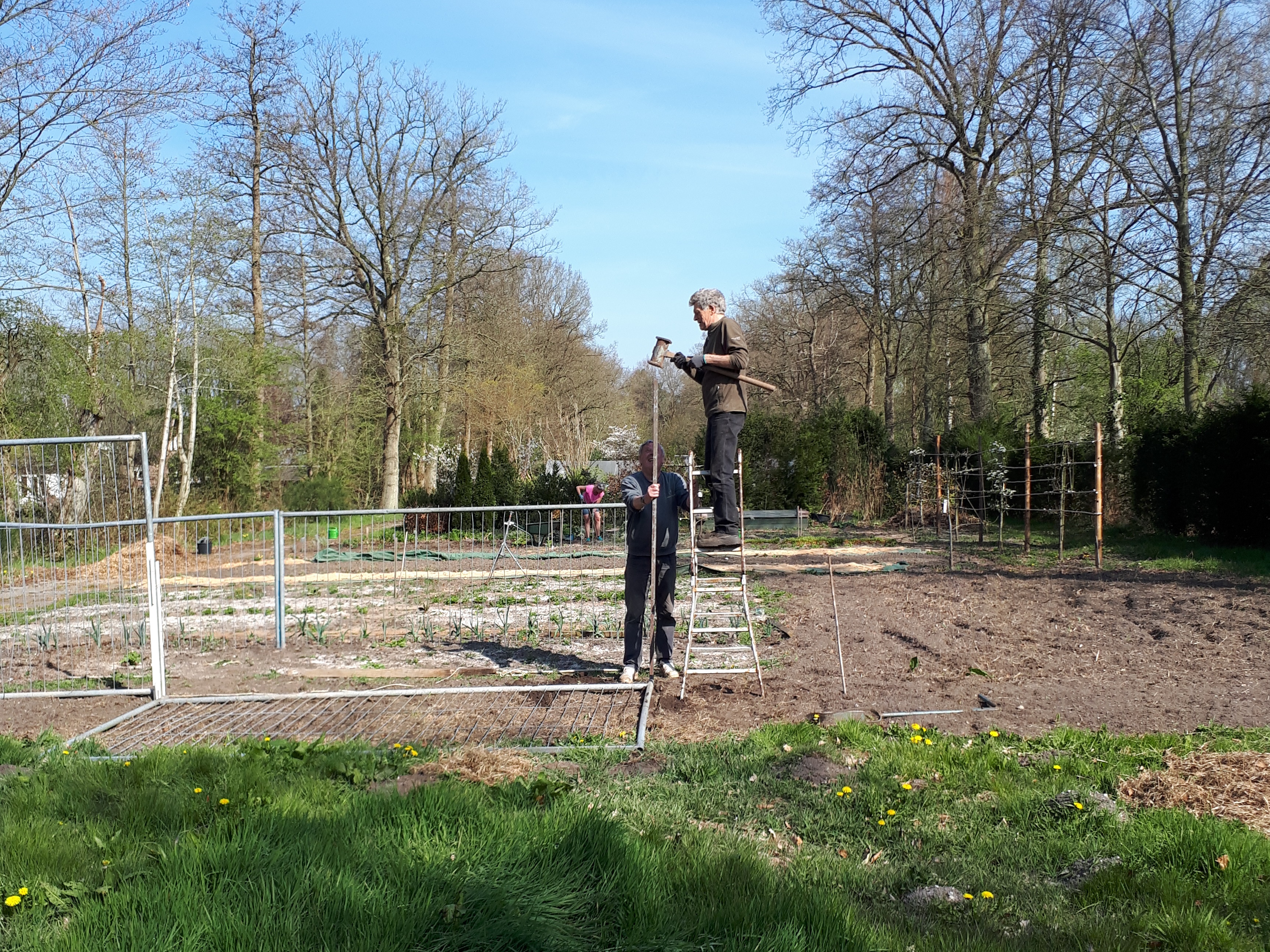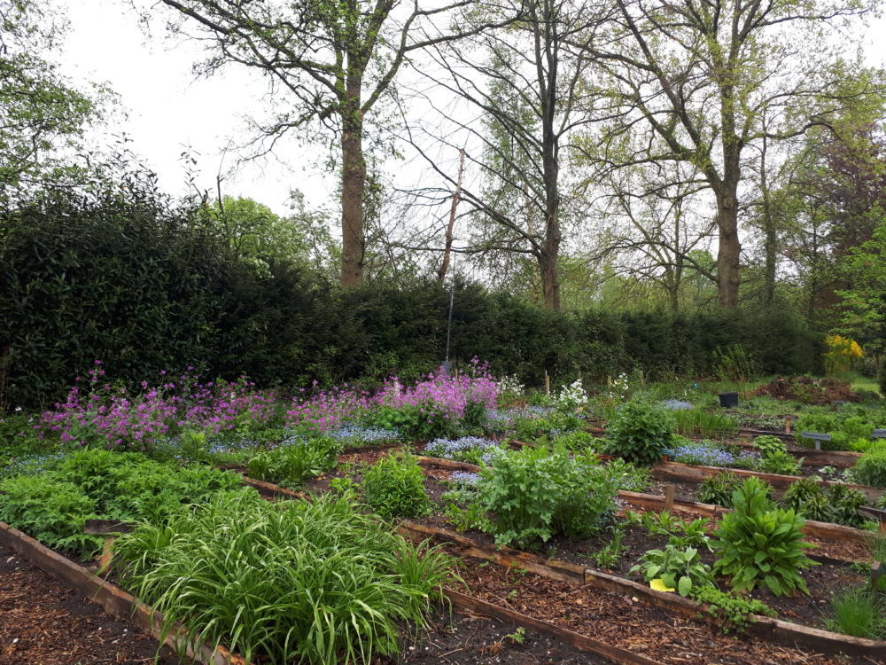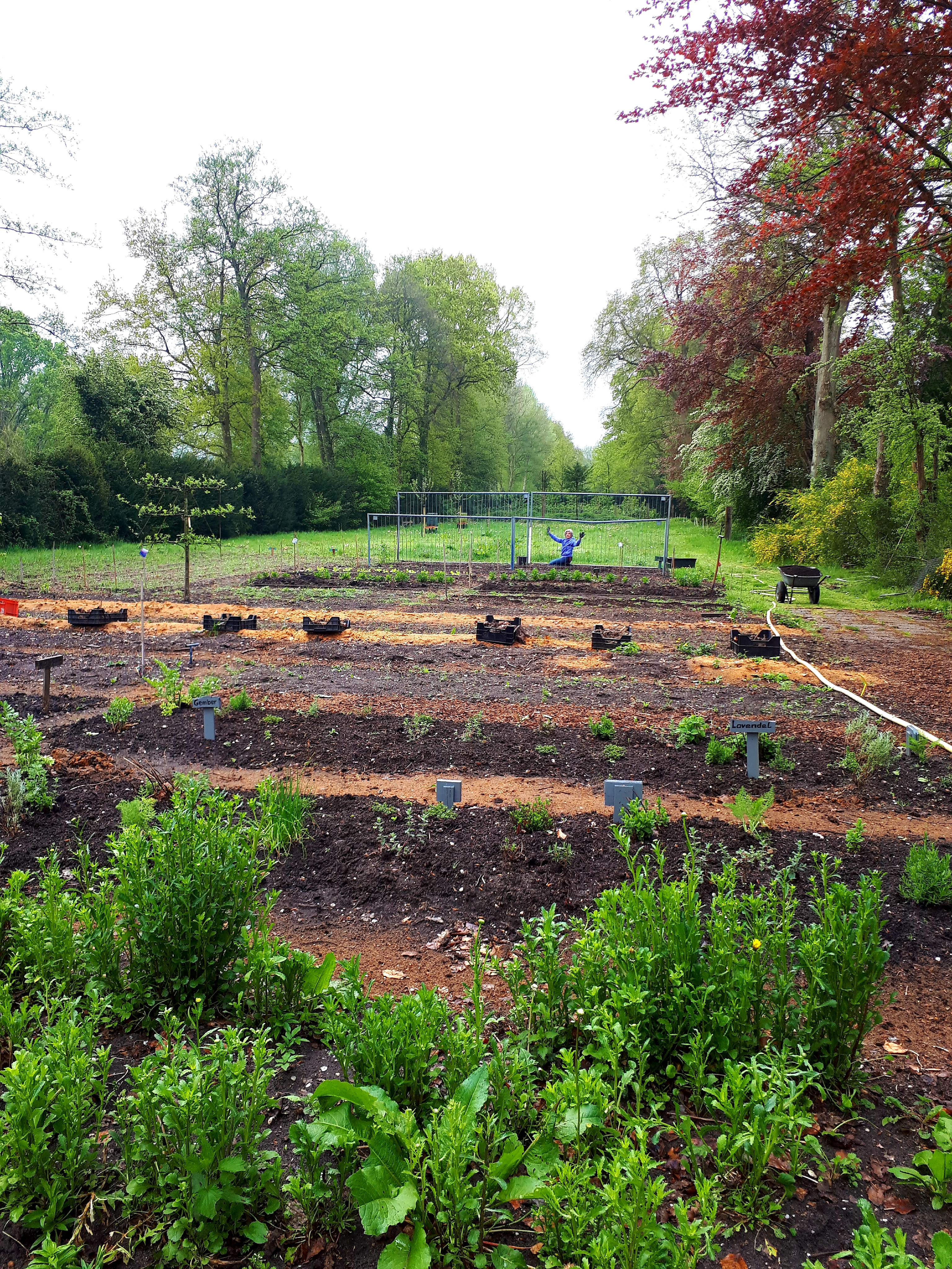 11 mei 2021 : De bessentuin is goed gesnoeid en gemaaid en belooft een grote opbrengst. Op de achtergrond een dubbele rij kersenbomen in bloei.