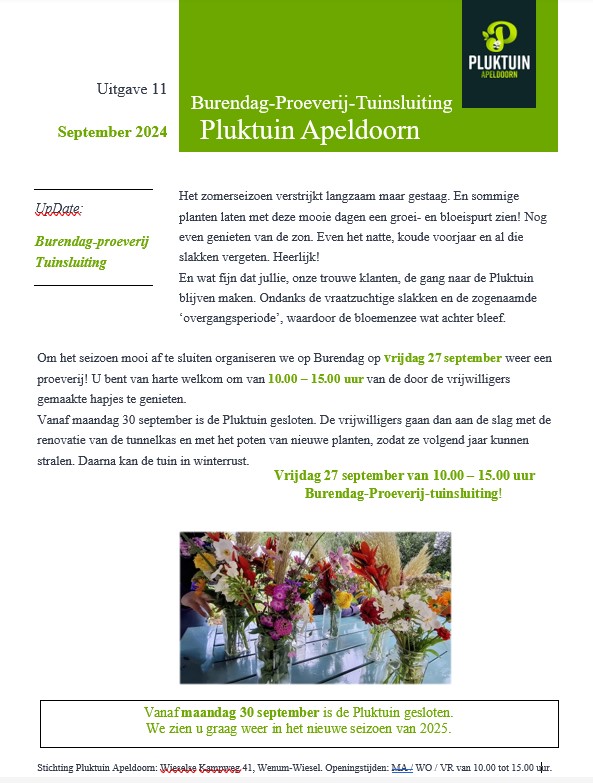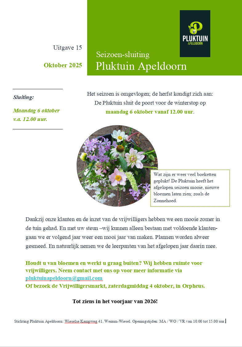 Houd uw mail en Facebook in de gaten: In de volgende Nieuwsbrief vertellen we wanneer de Pluktuin weer open gaat!