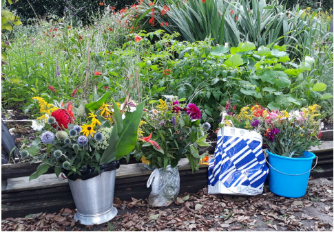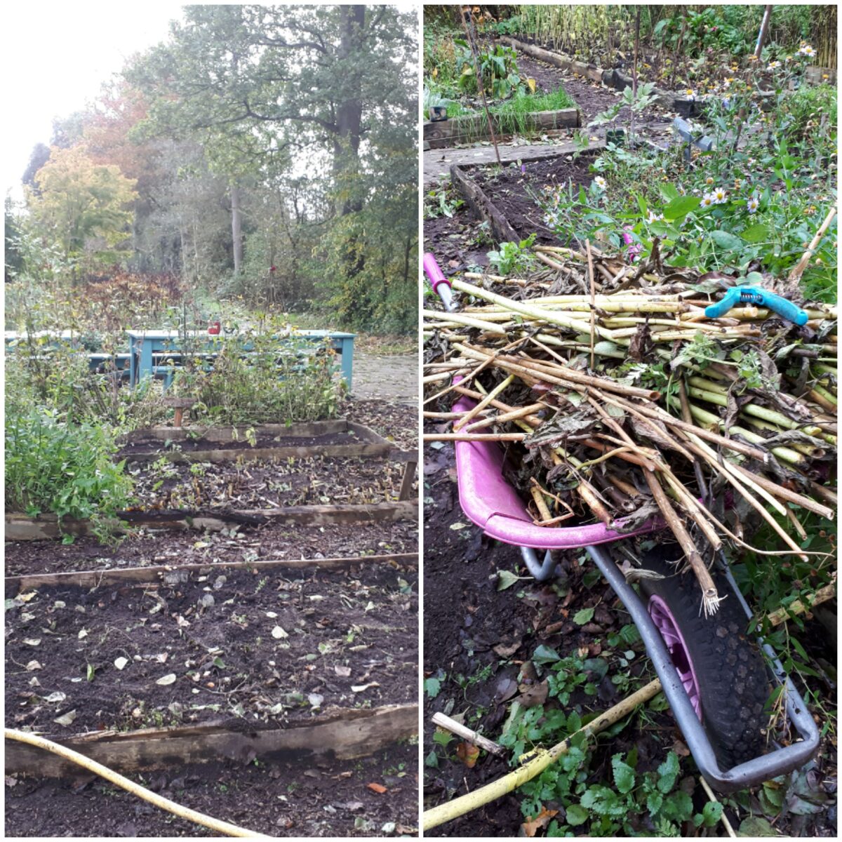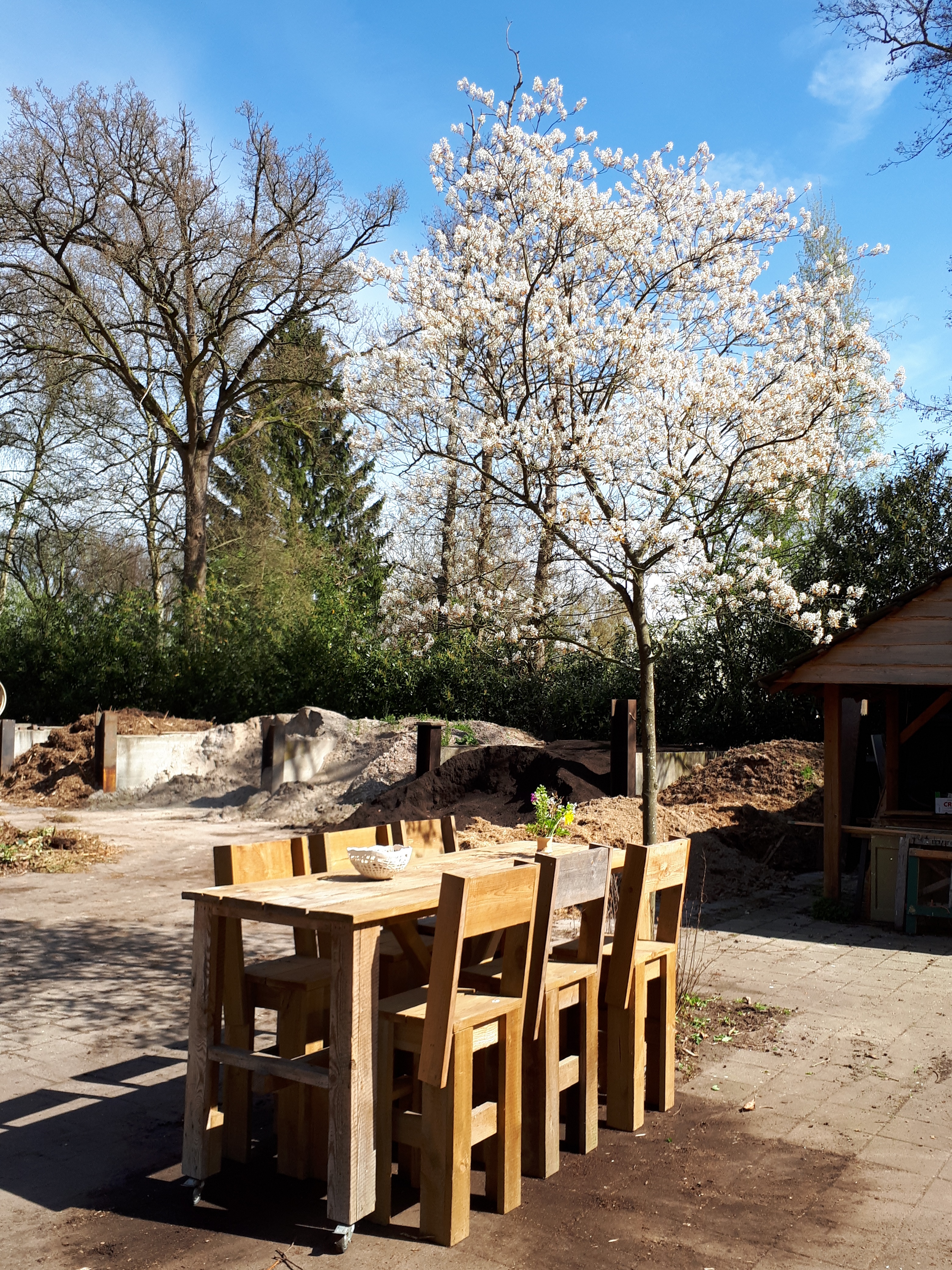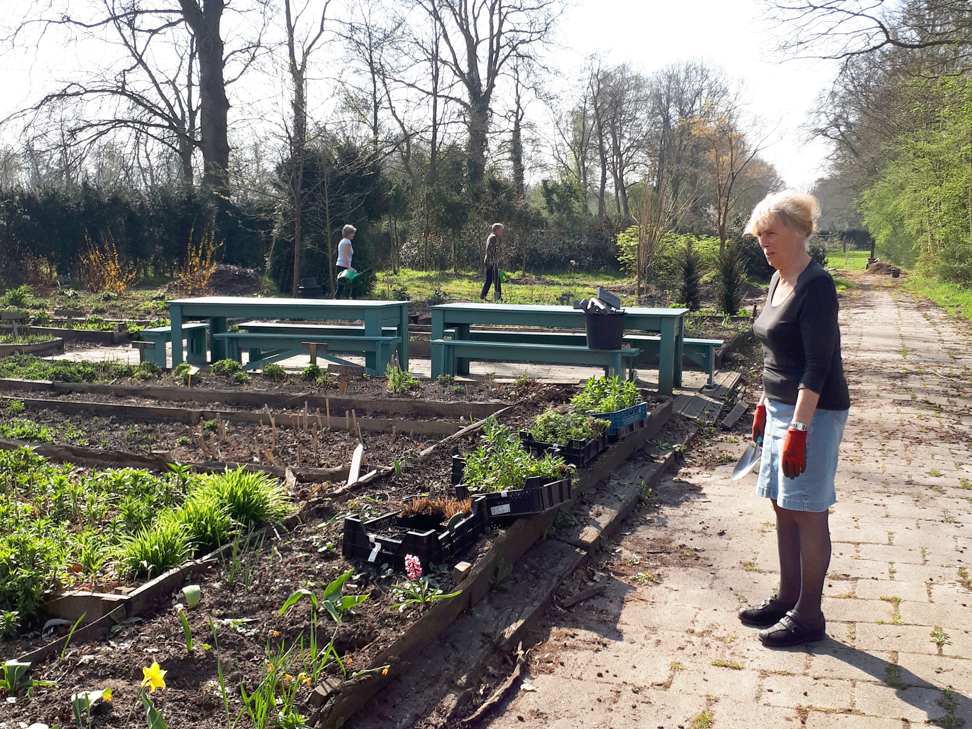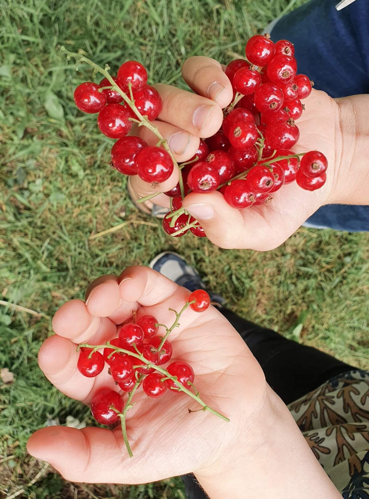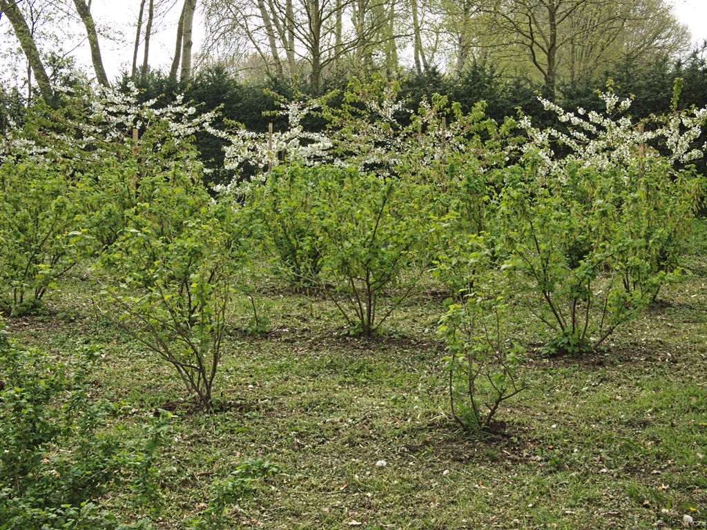 11 mei 2021 : De bessentuin is goed gesnoeid en gemaaid en belooft een grote opbrengst. Op de achtergrond een dubbele rij kersenbomen in bloei.