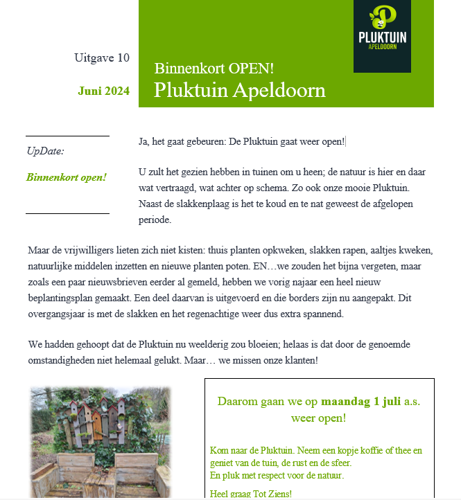 Houd uw mail en Facebook in de gaten: In de volgende Nieuwsbrief vertellen we wanneer de Pluktuin weer open gaat!